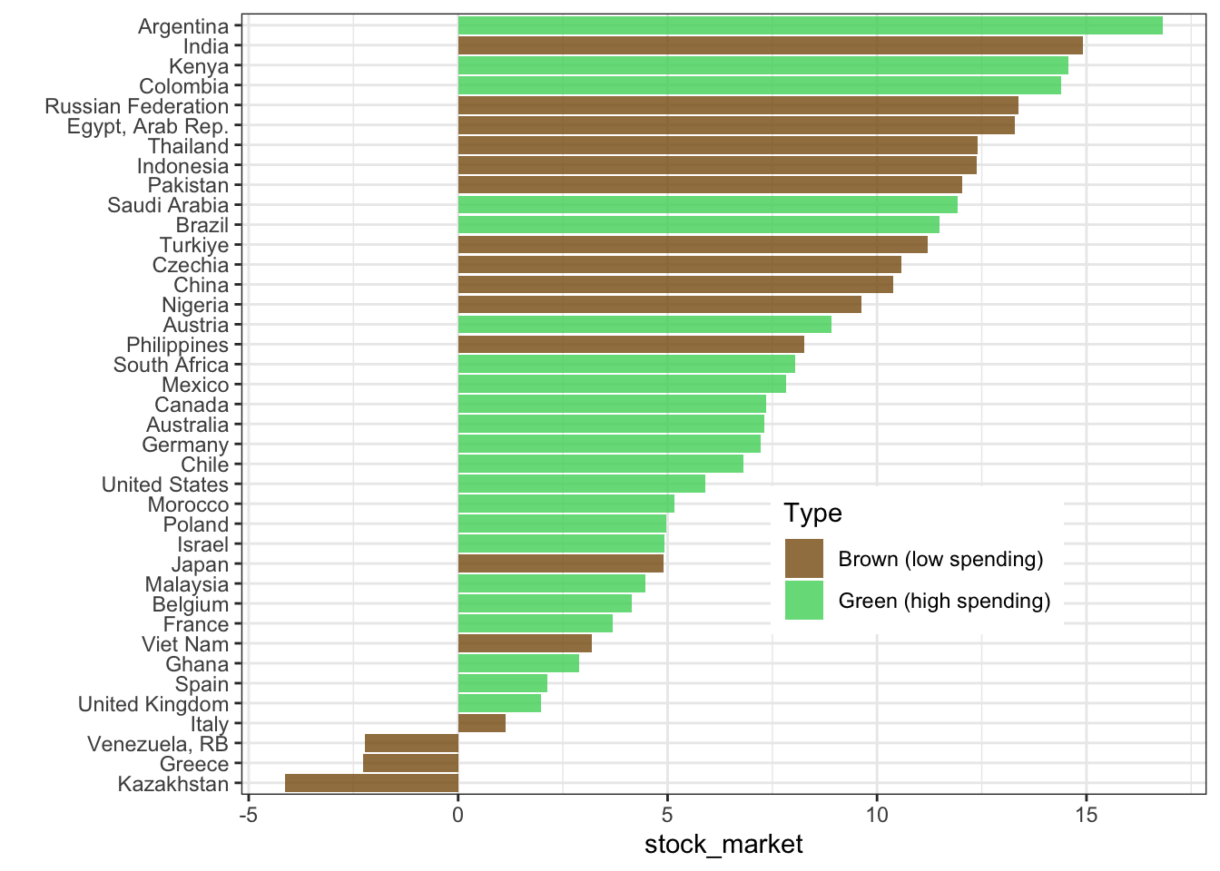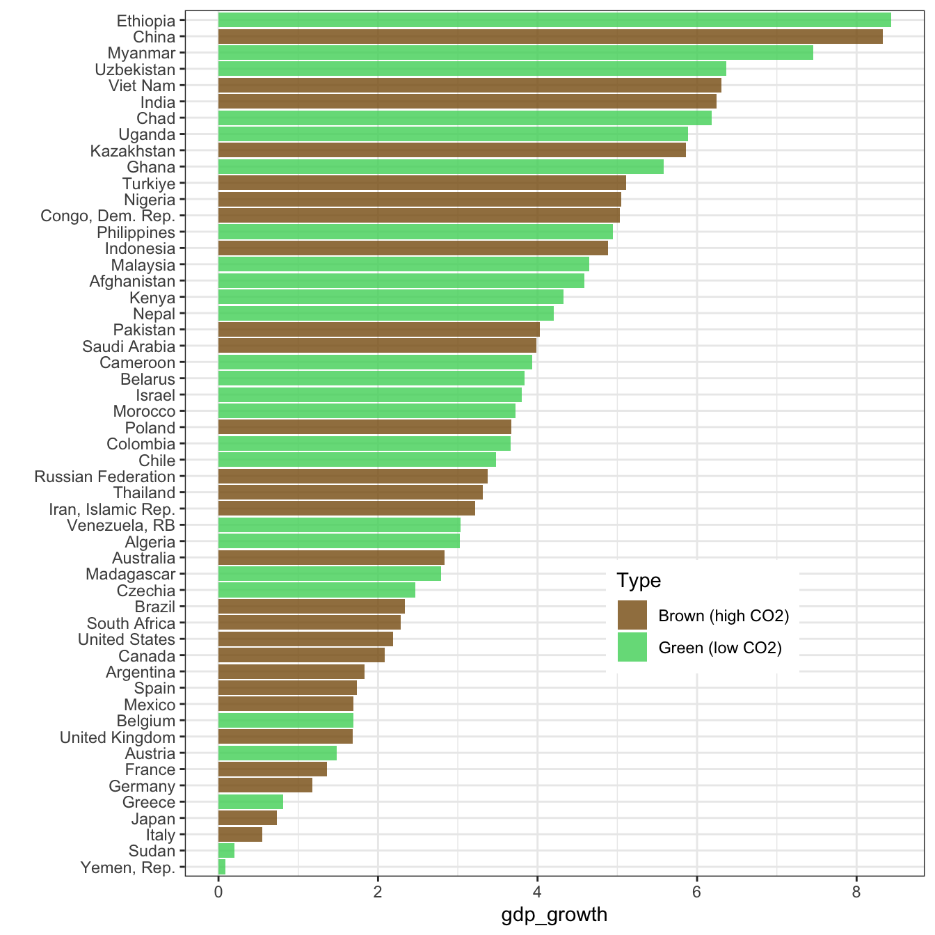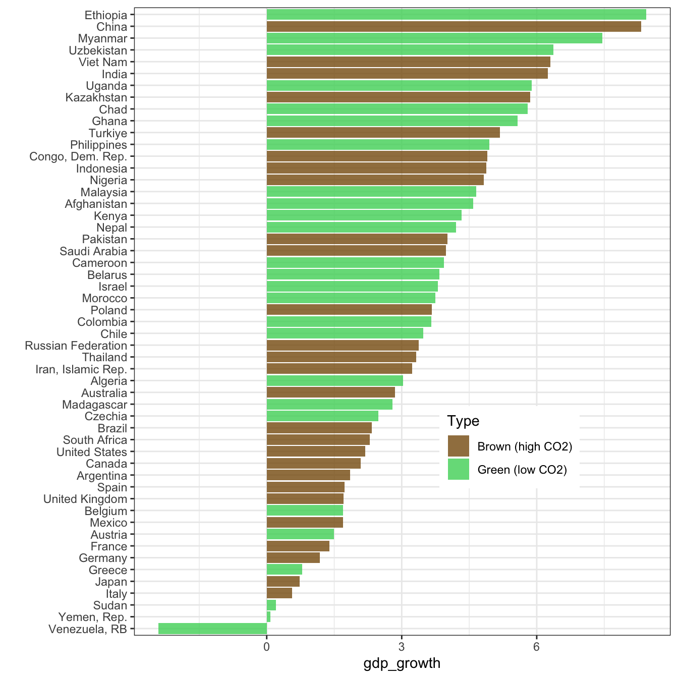 Green outperforms for both criteria! In more detail, for GDP growth: