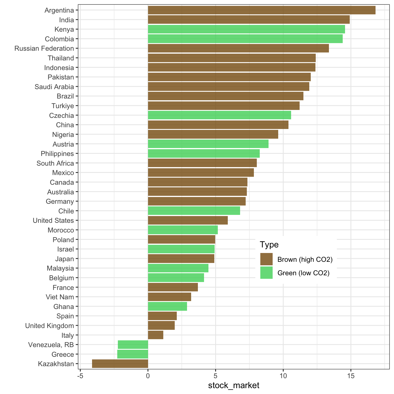 The question now is: is sustainability (in some sense) at the country level linked to some form of performance, either in terms of GDP, currency or equity market performance?