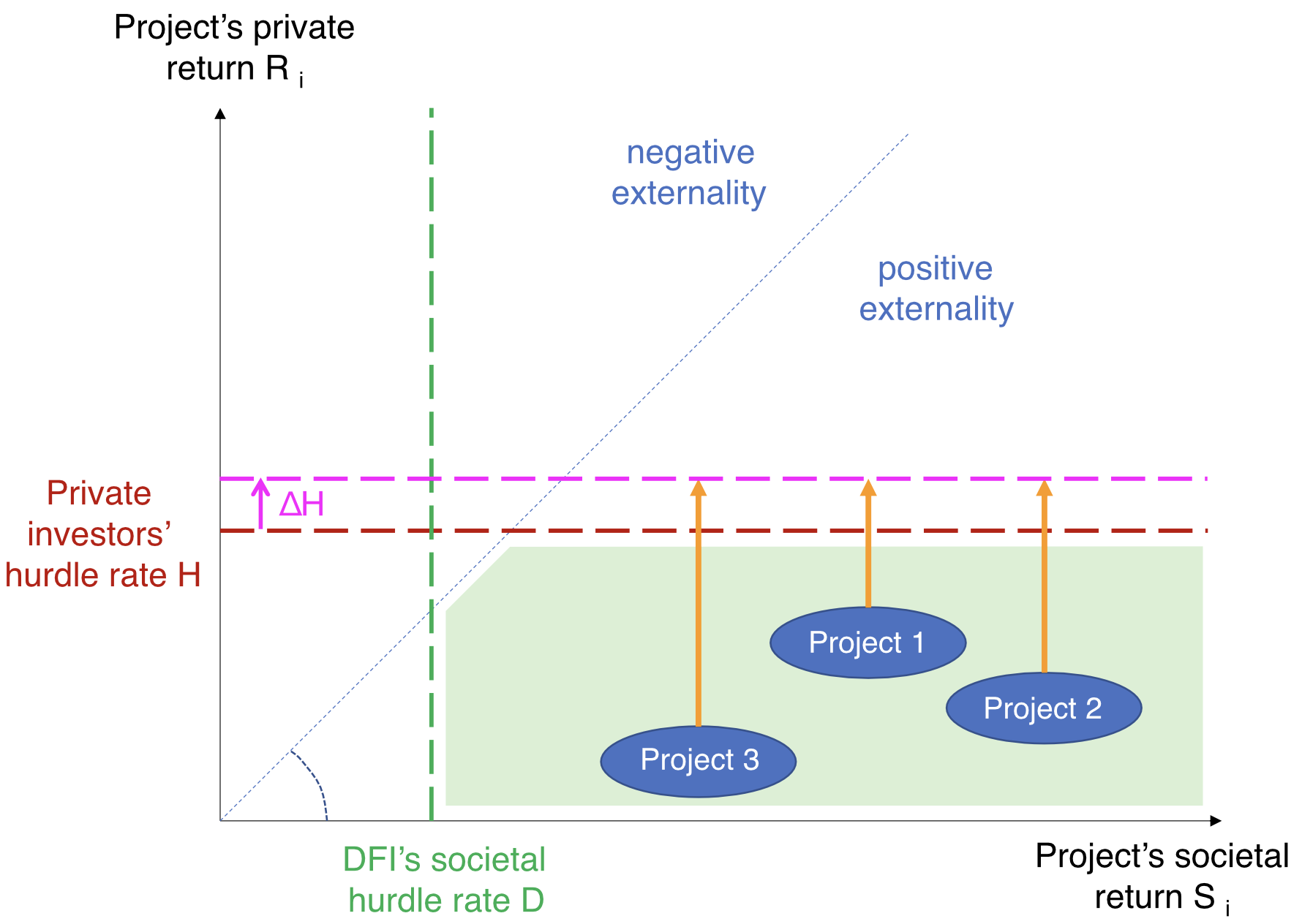 Private investors have hurdle rates for the return they expect but many projects do not pass this hurdle. But if the social impact is high enough, as DFI can supply some of the effort by asking a lower rate. DFIs provide concessional funding to raise private returns up to the market hurdle rate. The required concessionality equals the gap between a project’s private return and the private investors’ hurdle rate.